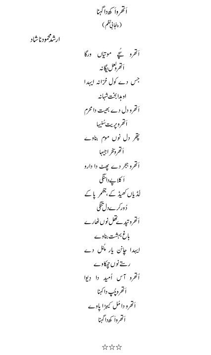 پنجابی نظم : اَتھرو اَکھ دا گہنا یہ تحریر 8 مرتبہ دیکھی گئی Posted by ارشد محمود ناشاد 24/03/2026 ارشد محمود ناشاد 24/03/2026
